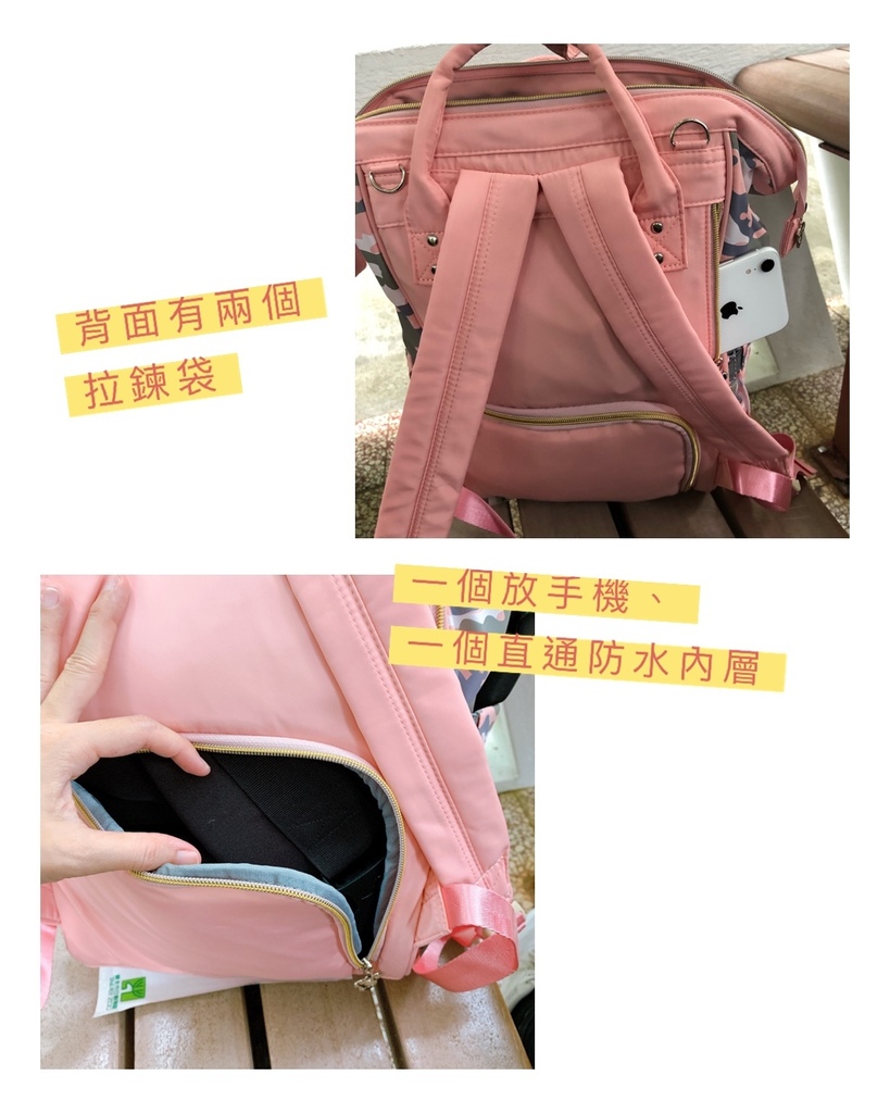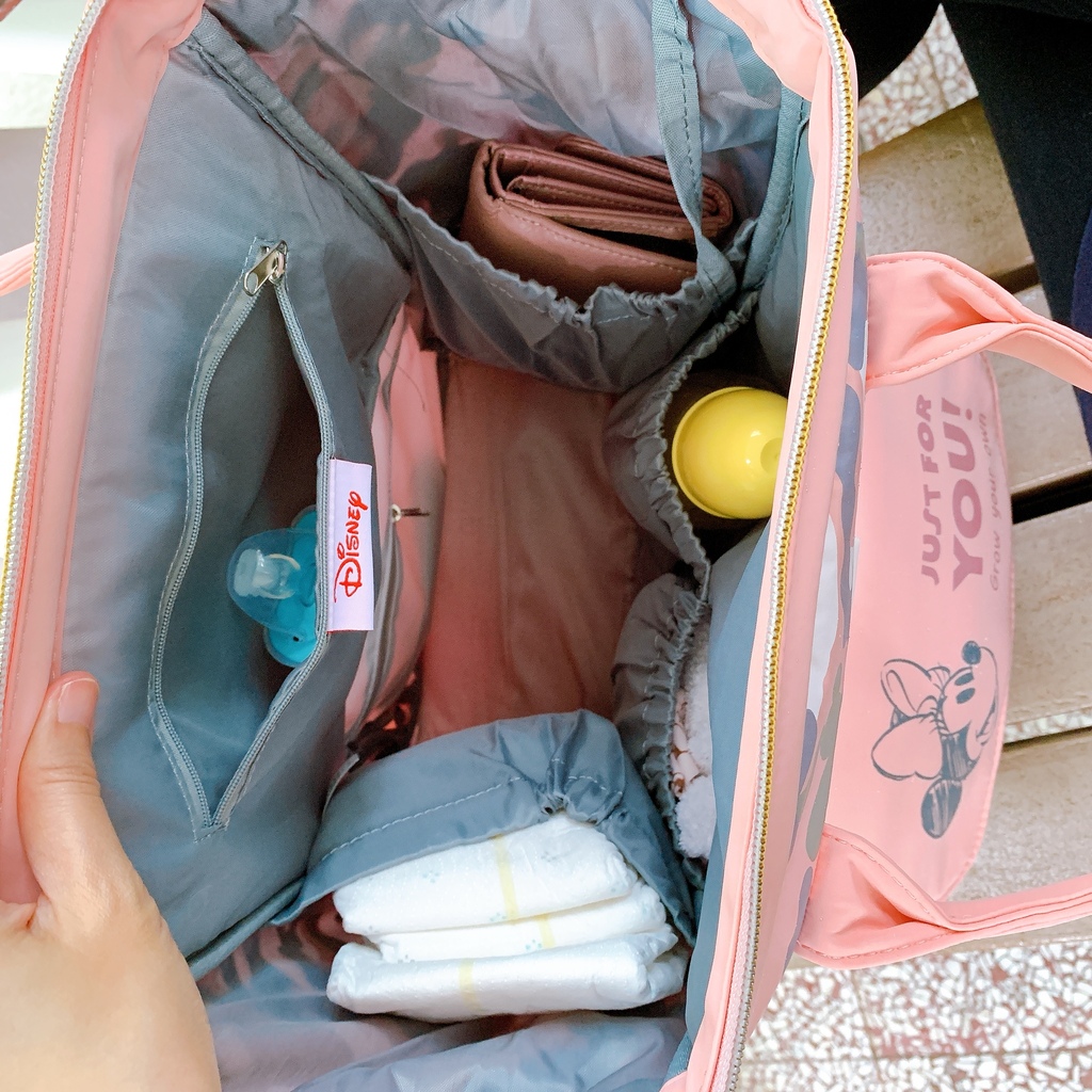 迪士尼聯名媽媽包有超強 防潑水皮層、 附防水內袋、 保溫內袋 和超貼心的USB暖暖墊,因為很多隔層,所以出門不用再把物品裝袋後放進包包,而是可以很直接地放進隔層中,直接做好分類,拿取方便又快速。